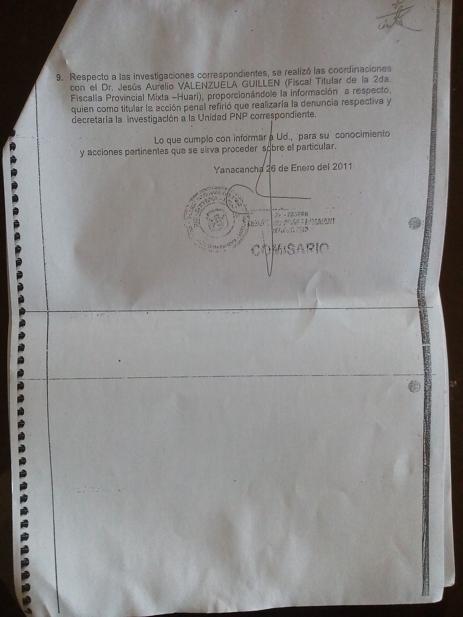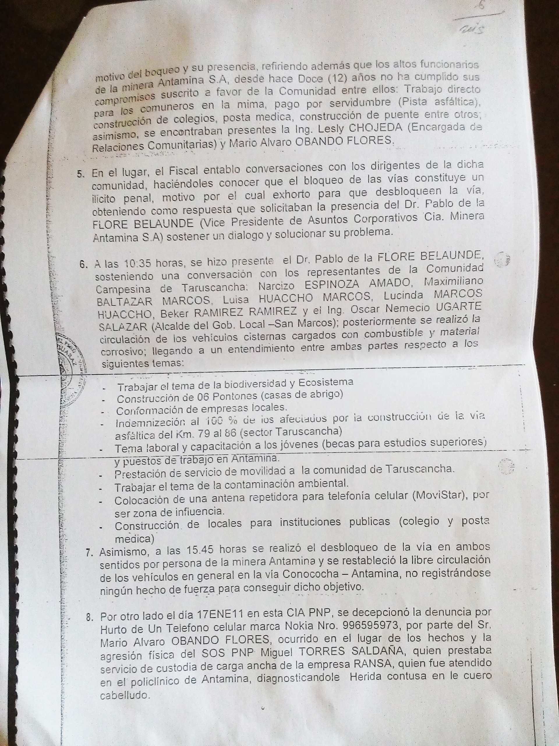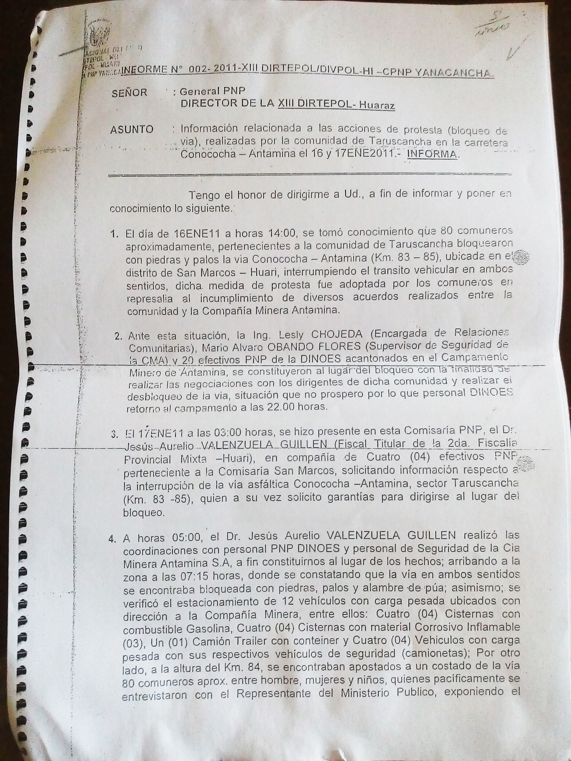 En ese sentido, dicho acuerdo también es mencionado en el Informe Policial de la comisaría de Yanacancha. Ahí se indica que la movilización de la comunidad es debido a que los altos funcionarios de la minera Antamina S.A. desde hace más de 12 años no han cumplido con una serie de compromisos, entre los cuales se menciona: la construcción de colegios, postas médicas, construcción de puentes y también el pago por servidumbre (Pista asfáltica).